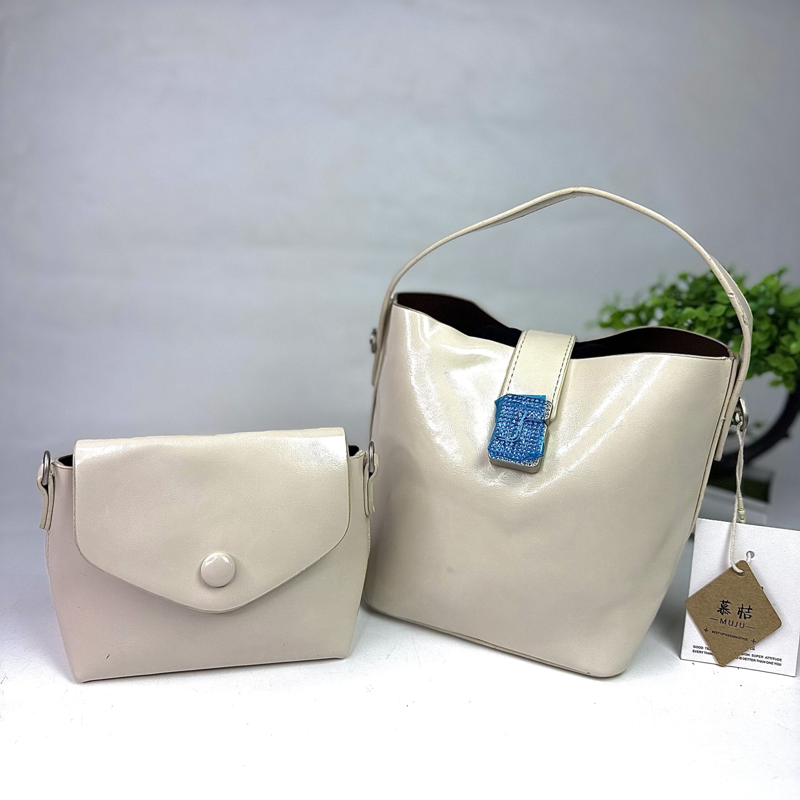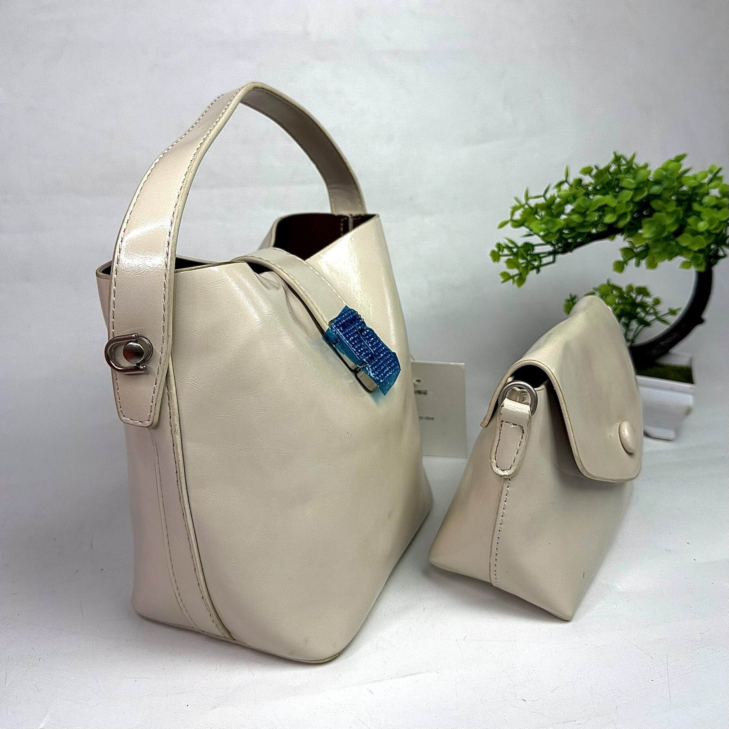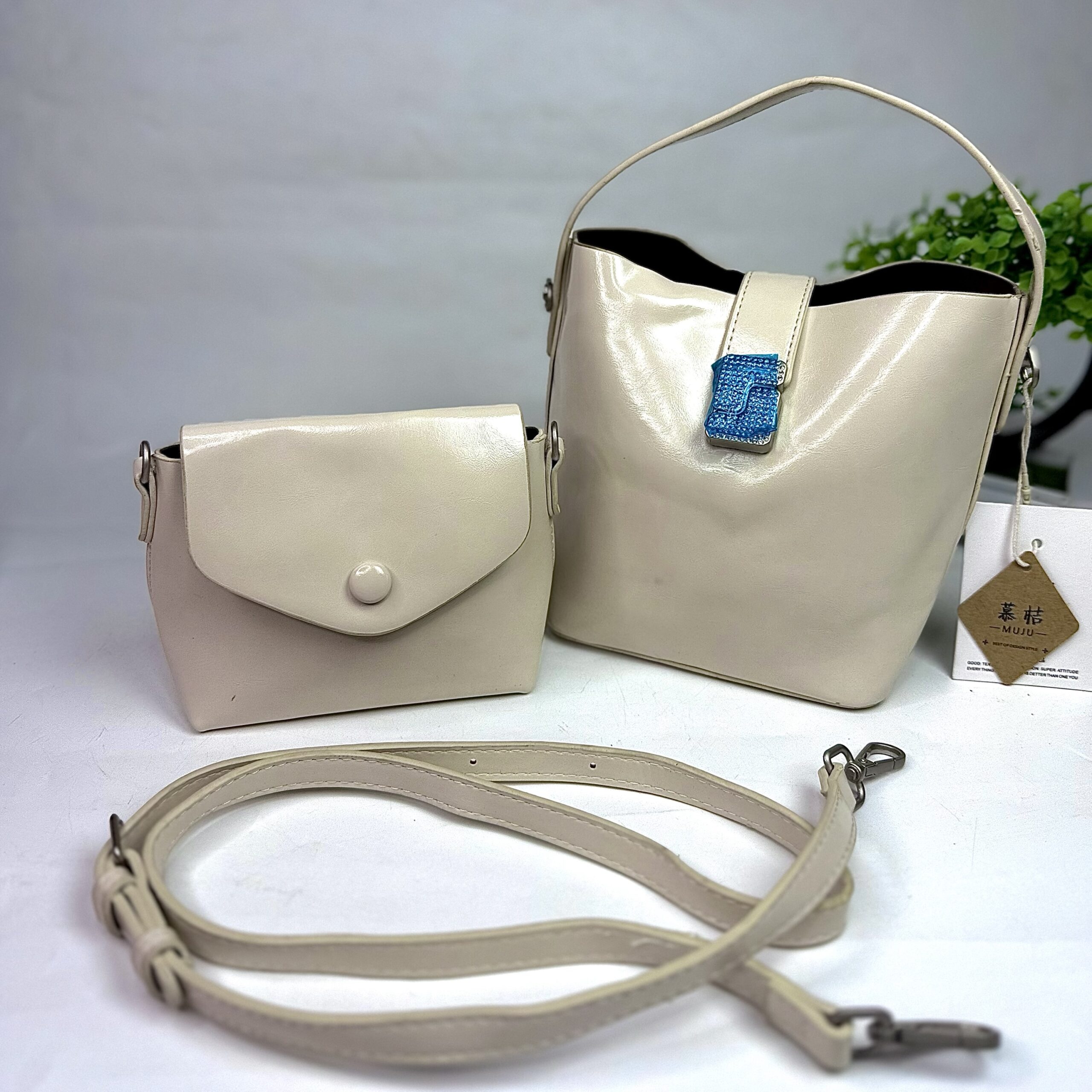This beige handbag is a bucket-style shoulder bag featuring a distinctive silver gemstone-embellished strap closure. It is a 2-in-1 set accompanied by a smaller matching crossbody bag or pouch.