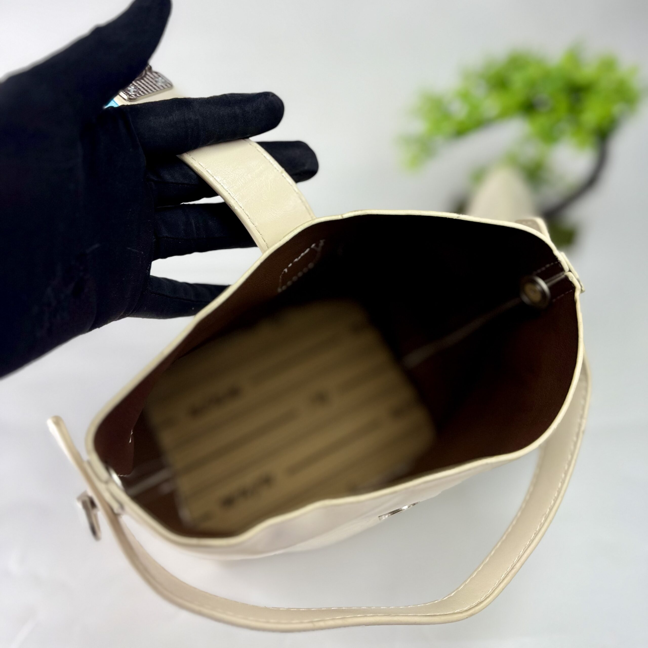 Structural bucket shape with a flat base.Top handle for shoulder or hand carry. crystal or stone buckle detail on the front magnetic strap. - Typical Dimensions: Approximately 22cm x 11cm x 19cm.