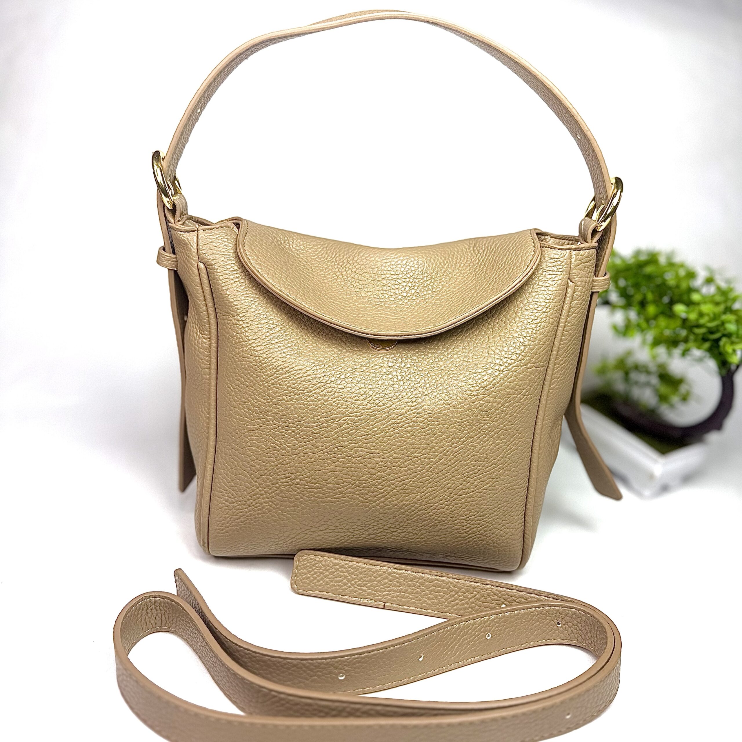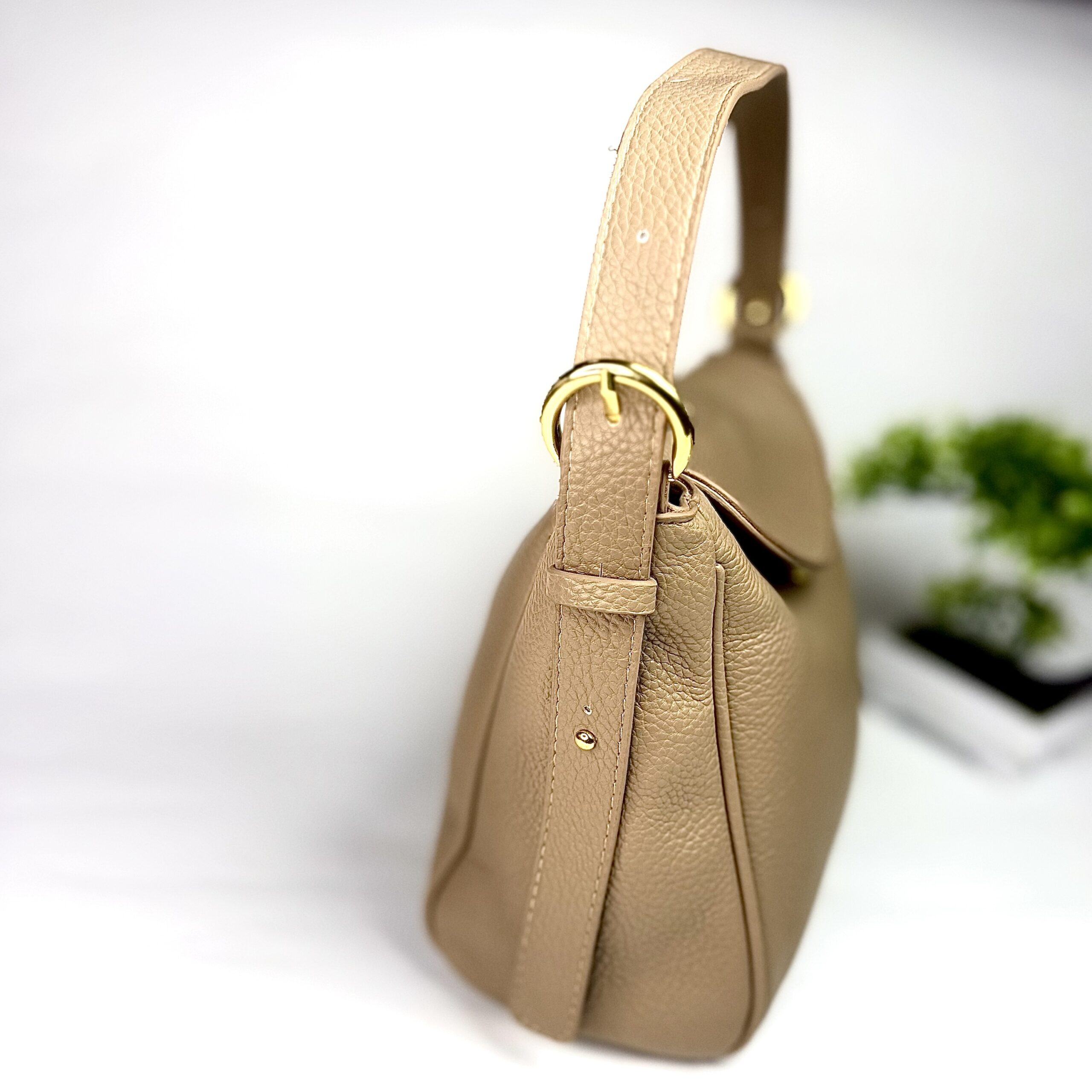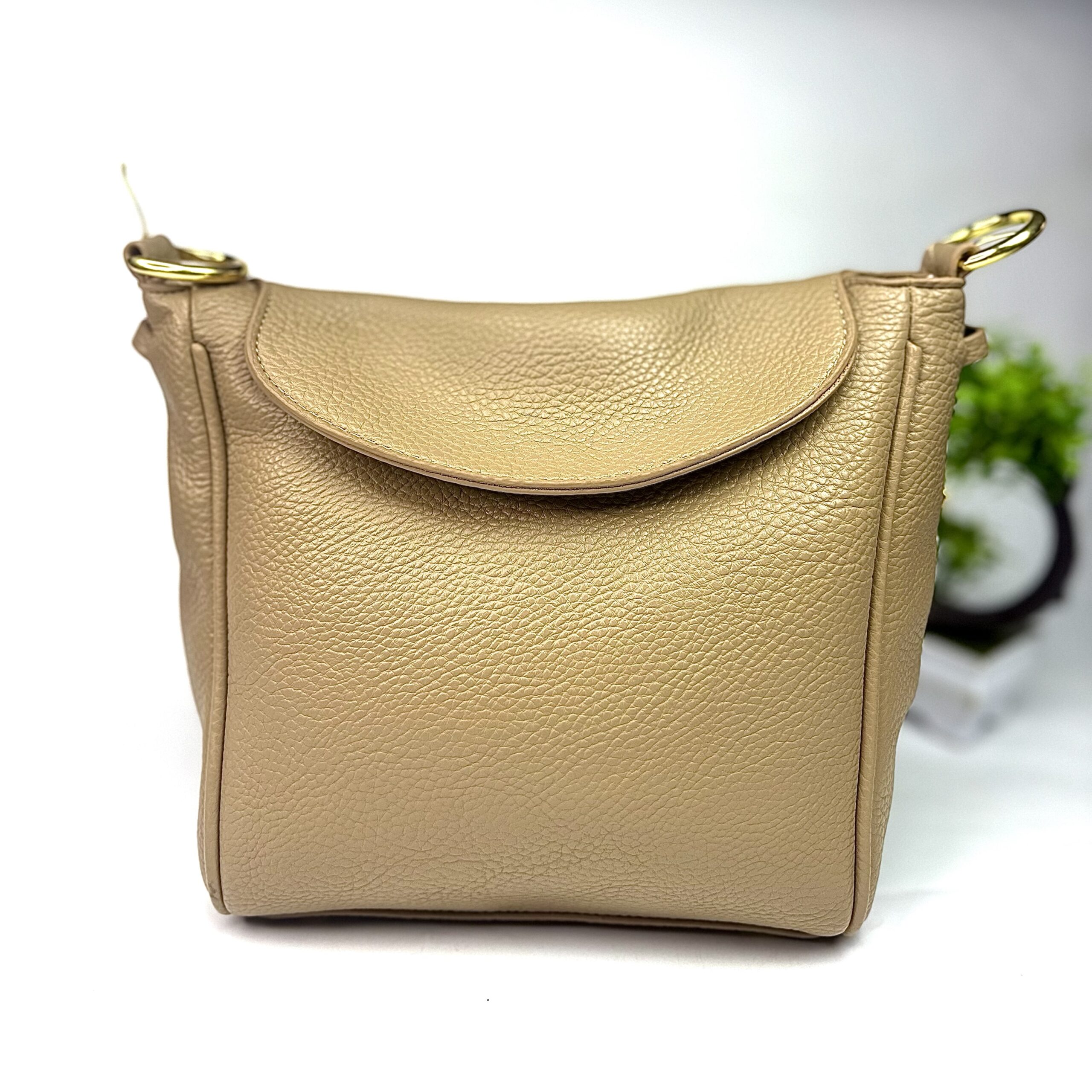 - Material: Textured tan calfskin leather, known for its soft, grained feel.